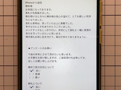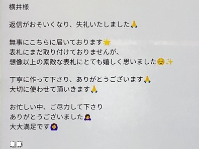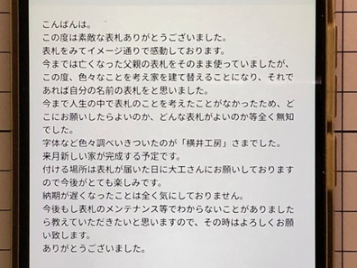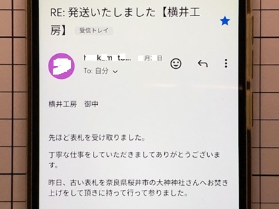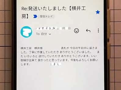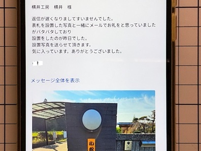 今日の工房を覗いてみる 最終更新:2026.1.1 窓外の景色 2026.1.1 AM7:50撮影 以前の”窓外の景色”は、画像をクリックすると ご覧頂けます。 ![]() ![]() 三重県鈴鹿市の天気予報を見てみる 小さな来客 "小さな来客"の記録は、画像をクリックすると ご覧頂けます。 ![]() お静かに。ZZZ・・・ 表札選びに迷ったら、お気軽にお電話ください。 本日の電話受付時間:8:00〜20:00 050−7301−5550 又は 090−3578−3583 営業時間内、メールでのお問い合わせ回答までのお時間は只今約3時間です。 メールでのお問い合わせはこちらをクリックして下さい。 お急ぎの場合は、お電話にてお願い致します。 心を込めた表札を、伊勢神宮を擁する三重県よりお届けします。 いただきましたご縁を大切に、 世界にひとつの格調高い、 手作りの表札をお届けいたします。 感謝とお詫び: