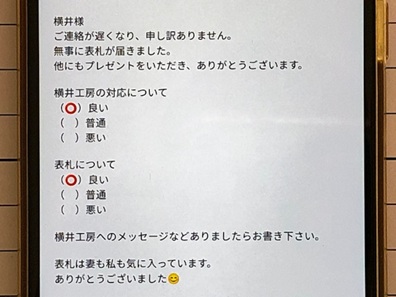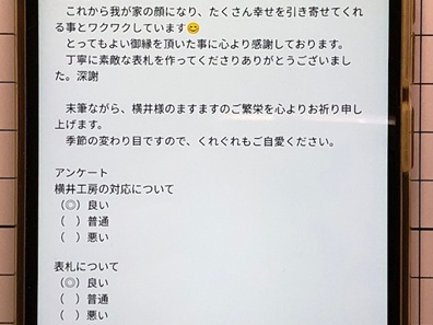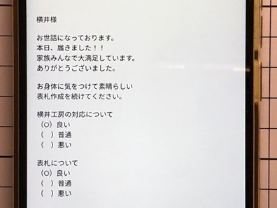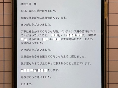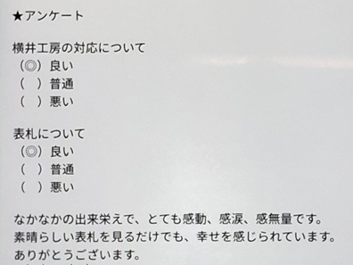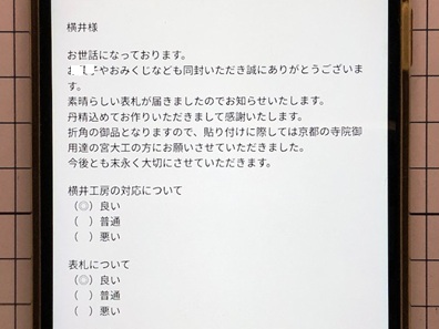 今日の工房を覗いてみる 最終更新:2025.11.15 窓外の景色 2025.11.15 AM7:10撮影 以前の”窓外の景色”は、画像をクリックすると ご覧頂けます。 ![]() ![]() 三重県鈴鹿市の天気予報を見てみる 小さな来客 "小さな来客"の記録は、画像をクリックすると ご覧頂けます。 ![]() お静かに。ZZZ・・・ 表札選びに迷ったら、お気軽にお電話ください。 本日の電話受付時間:8:00〜20:00 050−7301−5550 又は 090−3578−3583 営業時間内、メールでのお問い合わせ回答までのお時間は只今約3時間です。 メールでのお問い合わせはこちらをクリックして下さい。 お急ぎの場合は、お電話にてお願い致します。 心を込めた表札を、伊勢神宮を擁する三重県よりお届けします。 いただきましたご縁を大切に、 世界にひとつの格調高い、 手作りの表札をお届けいたします。 感謝とお詫び: